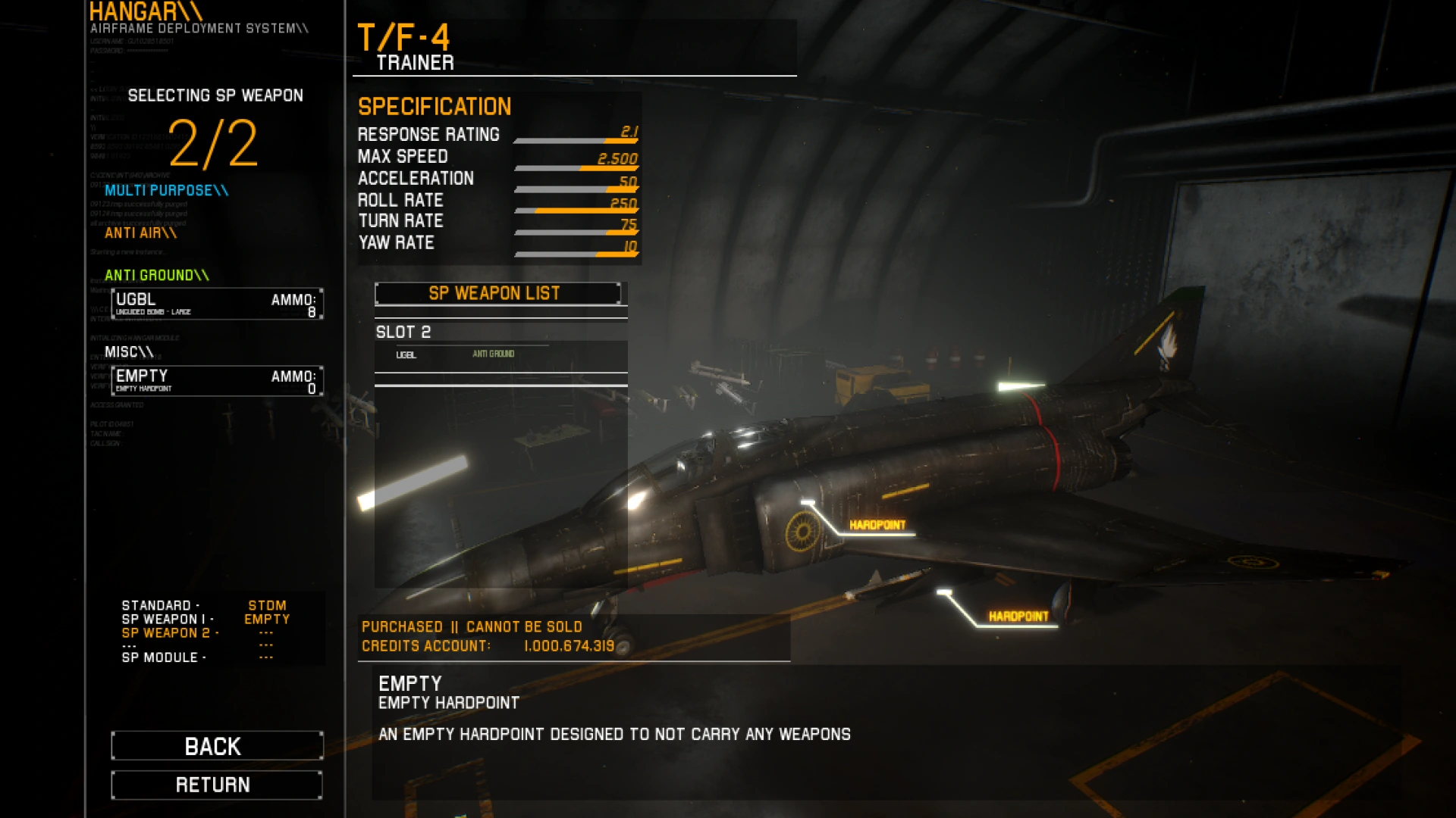 The T/F-4's hardpoint selection screen mistakenly counts the only hardpoint as the second one (2/2).